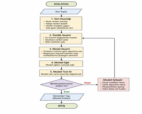 - Eğitim ve Test: Seçtiğin model eldeki verilerle eğitilir. Ardından, daha önce hiç görmediği